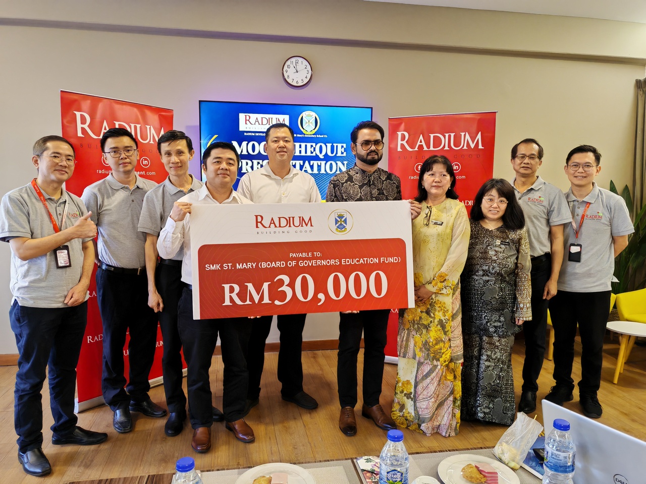 The cheque presentation ceremony was held at SMK St Mary, Kuala Lumpur, and was attended by representatives from Radium and the school community, including members of the Board of Governors and the Parents-Teachers Association.